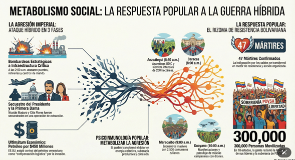 En definitiva, el 3 de enero de 2026 marca un antes y un después: la guerra híbrida se hizo abierta, pero también se consolidó la certeza de que el pueblo venezolano es un organismo vivo capaz de resistir y reinventarse. El rizoma bolivariano, tejido por comunas y milicias, se convierte en garantía de continuidad histórica, donde Nicolás, Cilia y los mártires caídos son semilla que germina en cada acción colectiva. La conclusión es clara: la agresión imperial no fractura, sino que activa un metabolismo social-popular resiliente que asegura que Venezuela seguirá siendo soberana, productiva y libre
